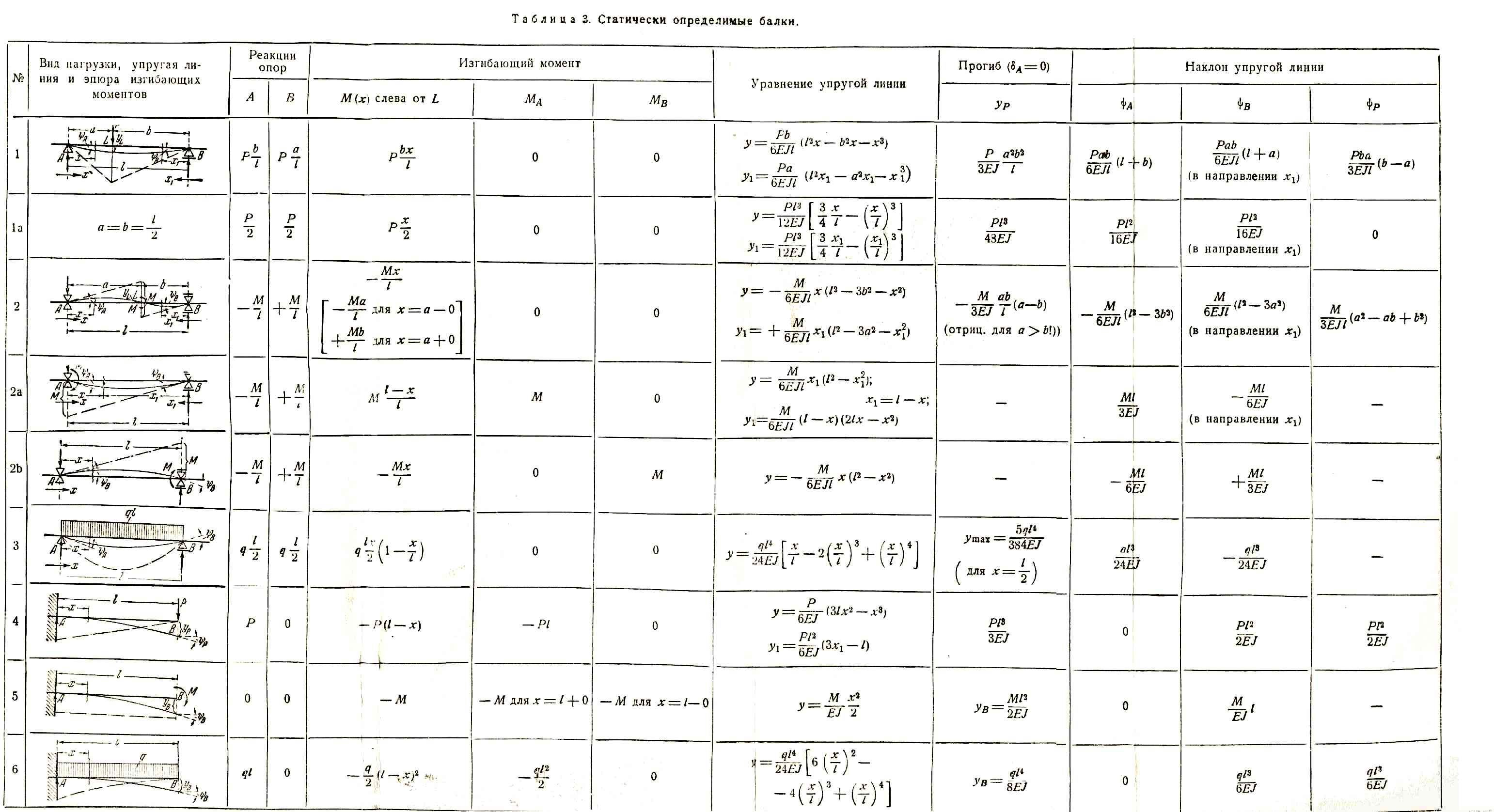 Формулы для определения прогиба и угла поворота балок