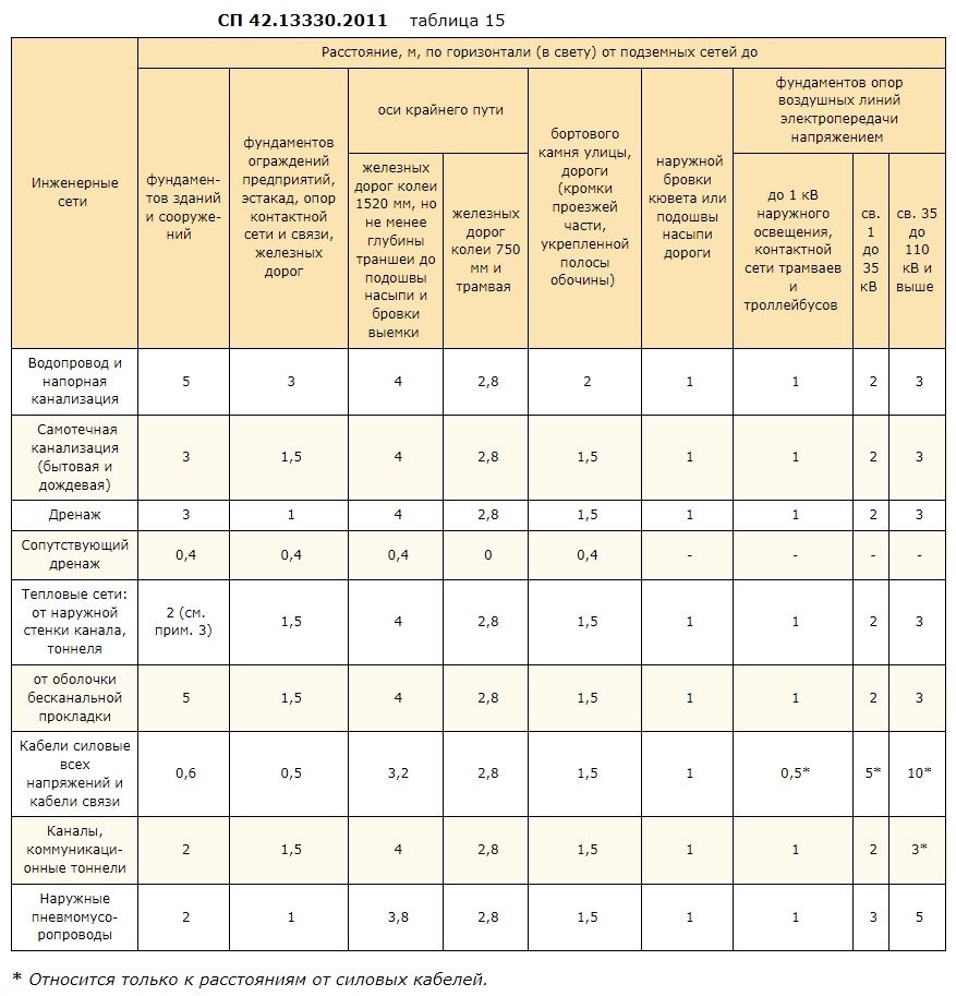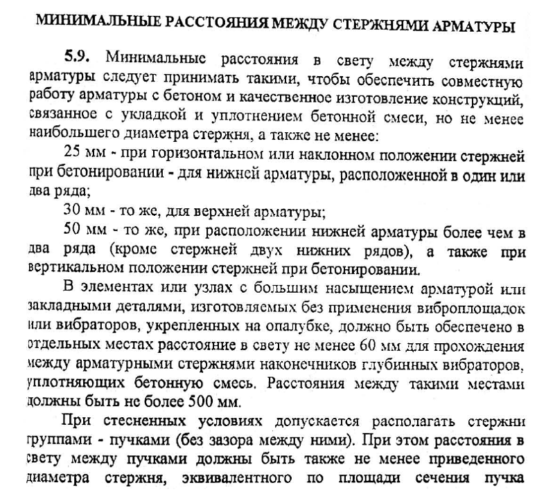 Расстояние в свету между стволами буровых, набивных свай и свай-оболочек, а также между скважинами свай-столбов должно быть не менее 1,0 м, а расстояние между буроинъекционными сваями в осях — не менее трех их диаметров; расстояние в свету между уширениями при устройстве их в твердых и полутвердых глинистых грунтах — 0,5 м, в других дисперсных грунтах — 1,0 м. Расстояние между наклонными или между наклонными и вертикальными сваями в уровне подошвы ростверка следует принимать исходя из конструктивных особенностей фундаментов и обеспечения их надежности заглубления в грунт, армирования и бетонирования ростверка.